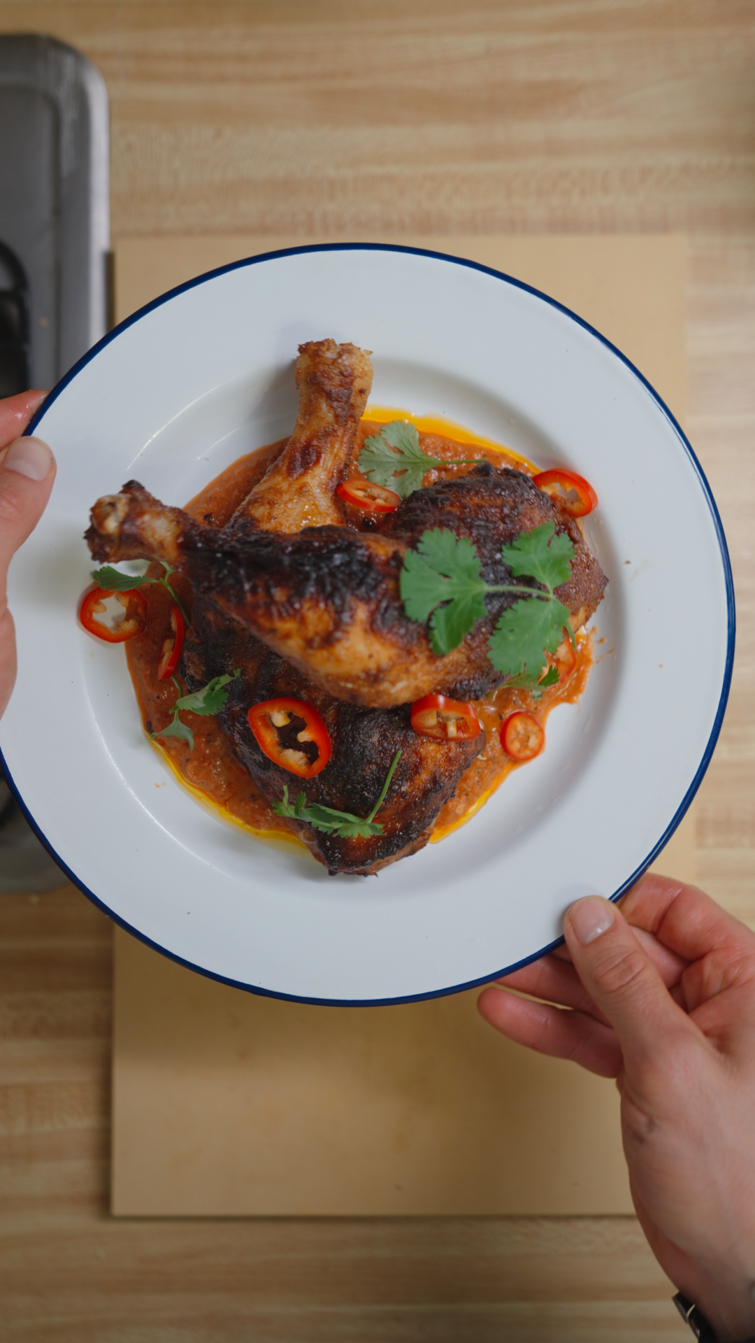 - To plate, spoon the romesco sauce down on a plate and top with the chicken, cilantro and fresno chilis