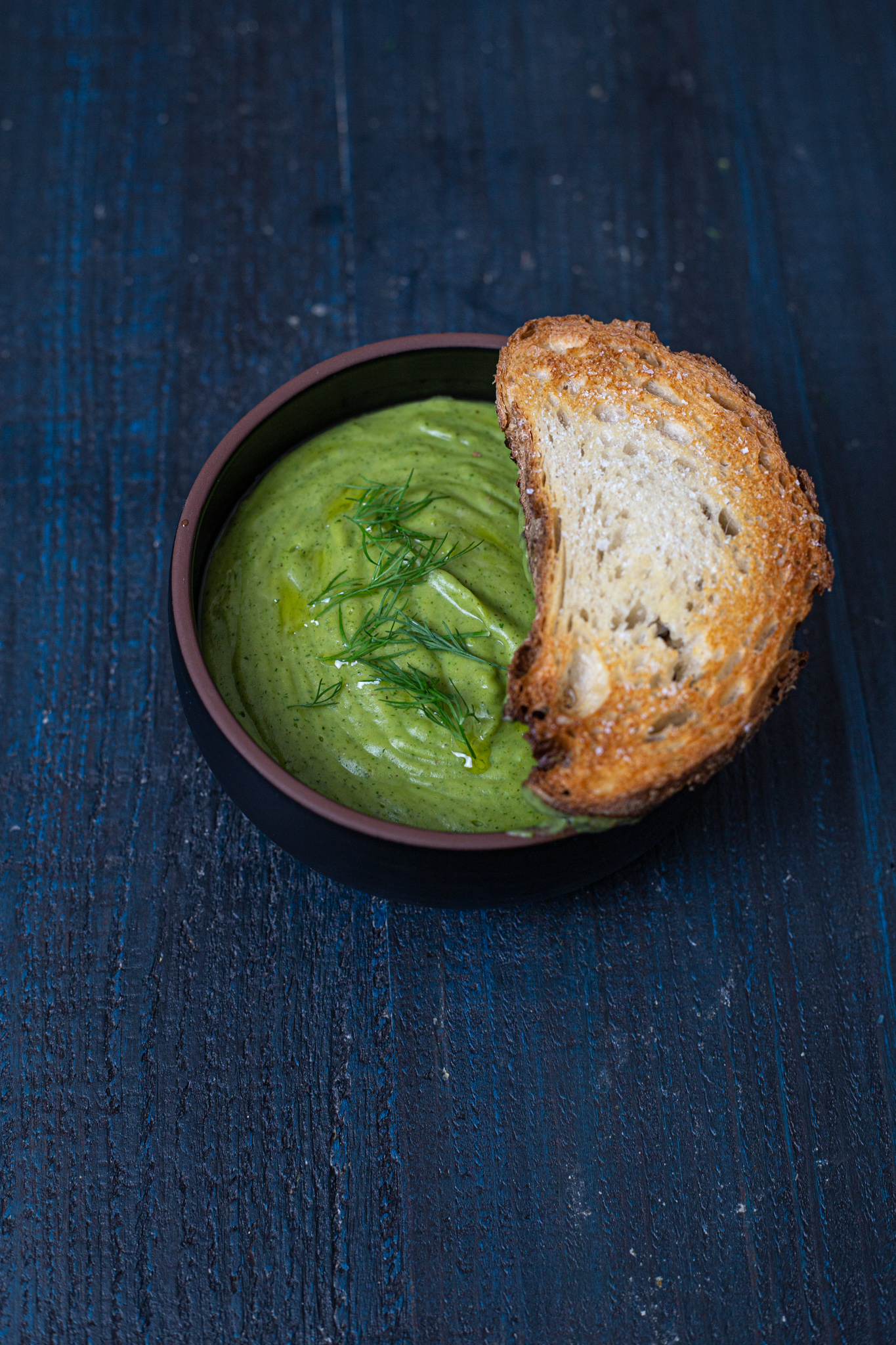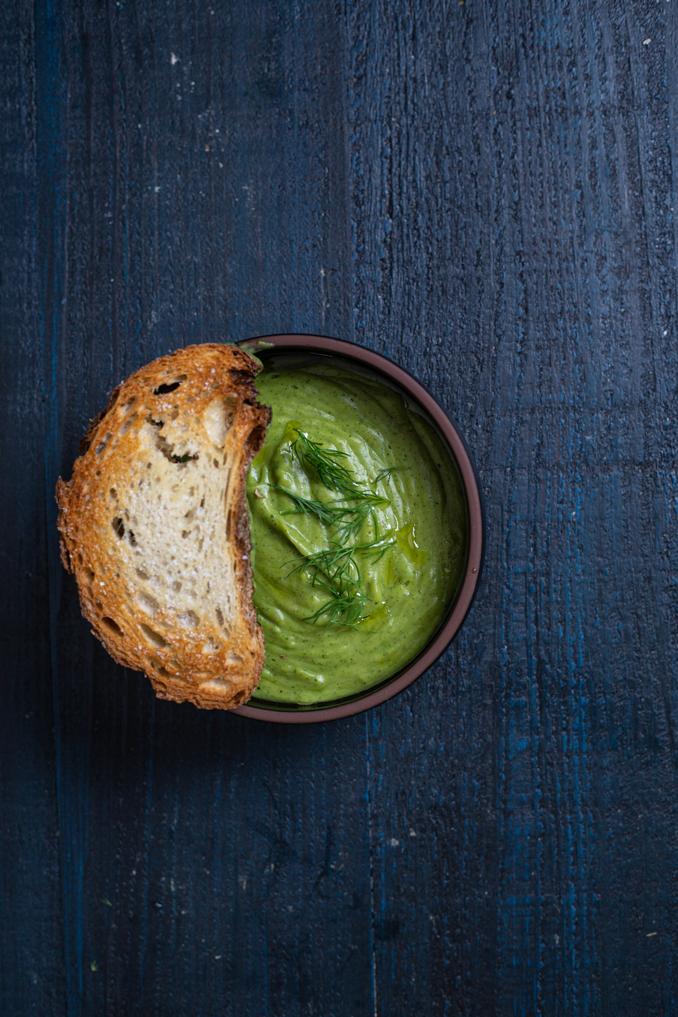 3. In a pan on medium-high heat, drizzle 1 tbsp olive oil. Toast the bread. Grate a garlic clove on the toast—cut croutons. Serve with the soup.