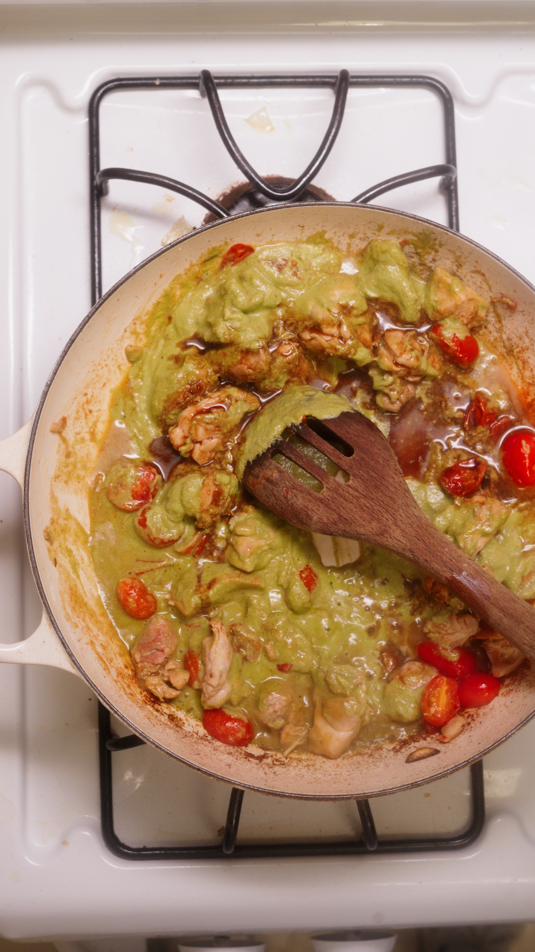 4. Sear the remaining tomatoes for 2 minutes in the chicken pan, then add the pesto sauce. Drain pasta, reserve some water, and toss everything together. Adjust seasoning and consistency with reserved water.