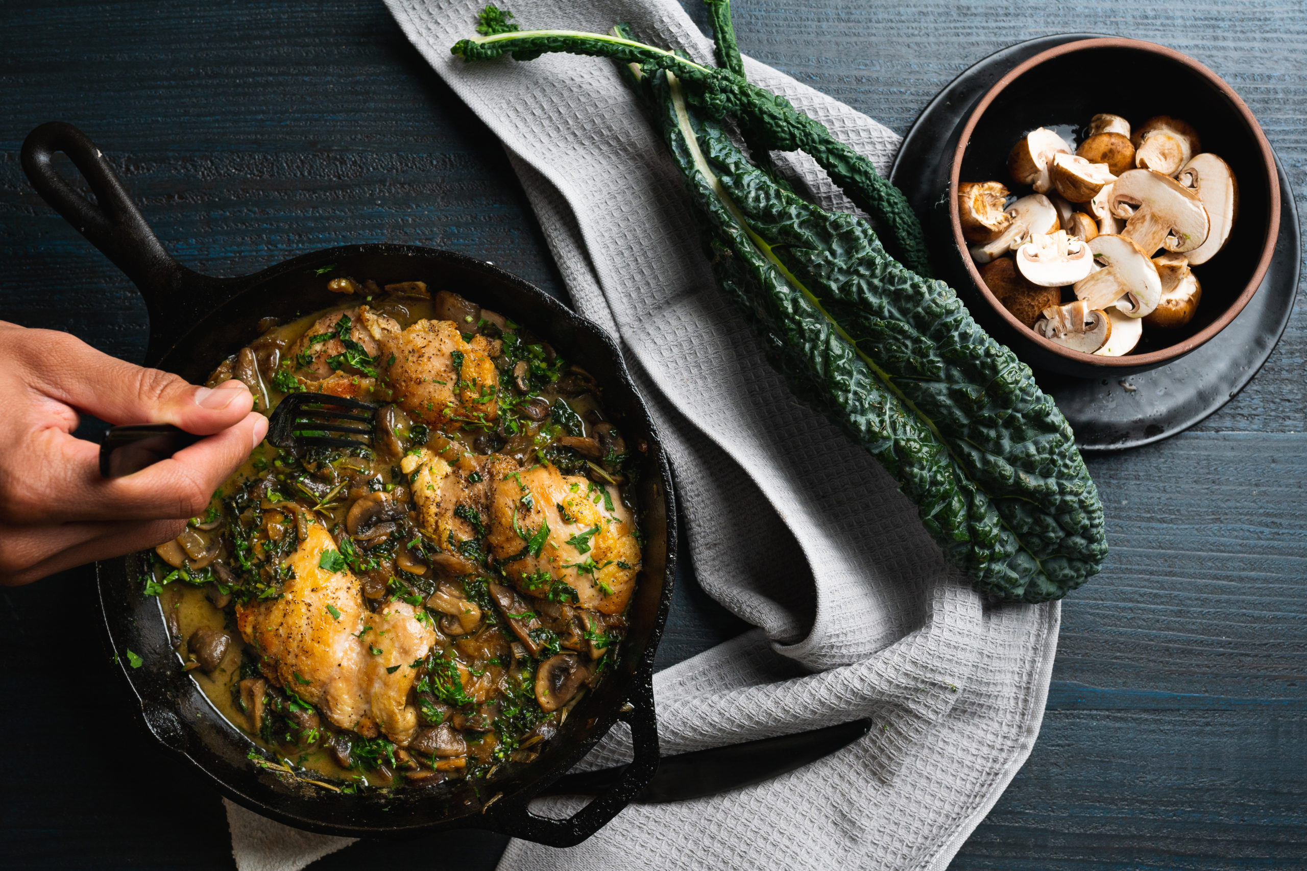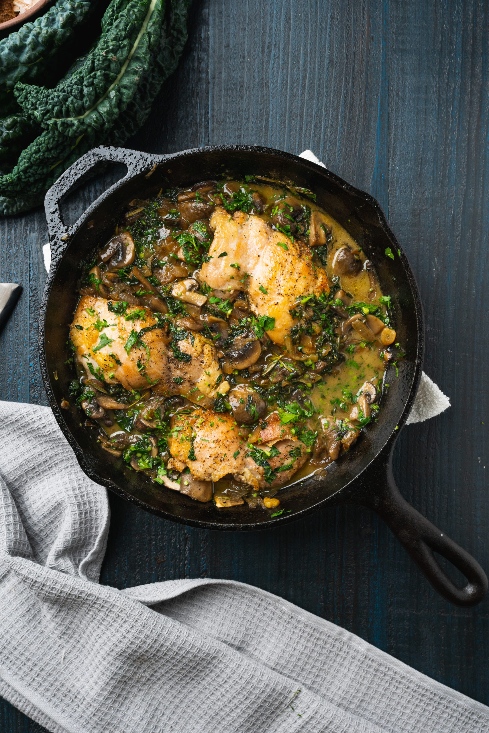 5. Create a nest in the mushroom preparation. Add the chicken on the uncooked side. Add the kale.