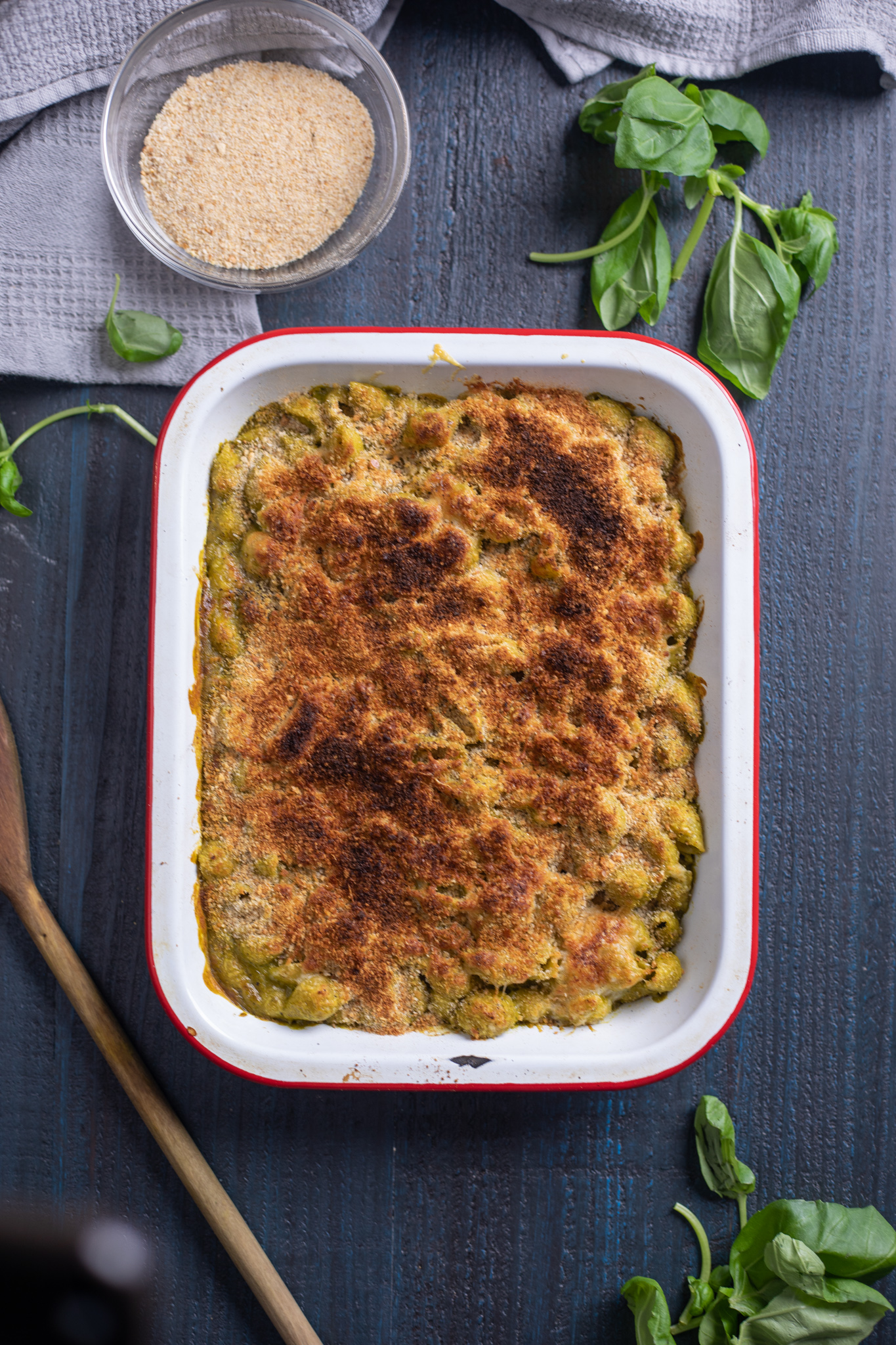 8. Pour the pasta and cheesy sauce into a baking dish. Sprinkle with grated cheese and breadcrumbs.