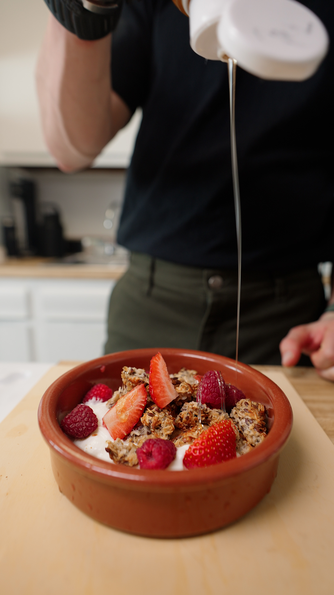 2. In a medium mixing bowl, combine your oats, shredded coconut, walnuts, protein, and salt and stir well. In a small mixing bowl, stir together the maple syrup and oil, then add the eggs or flaxseed eggs and whisk until smooth. Pour the maple syrup mixture into the oat mixture and stir to coat well.