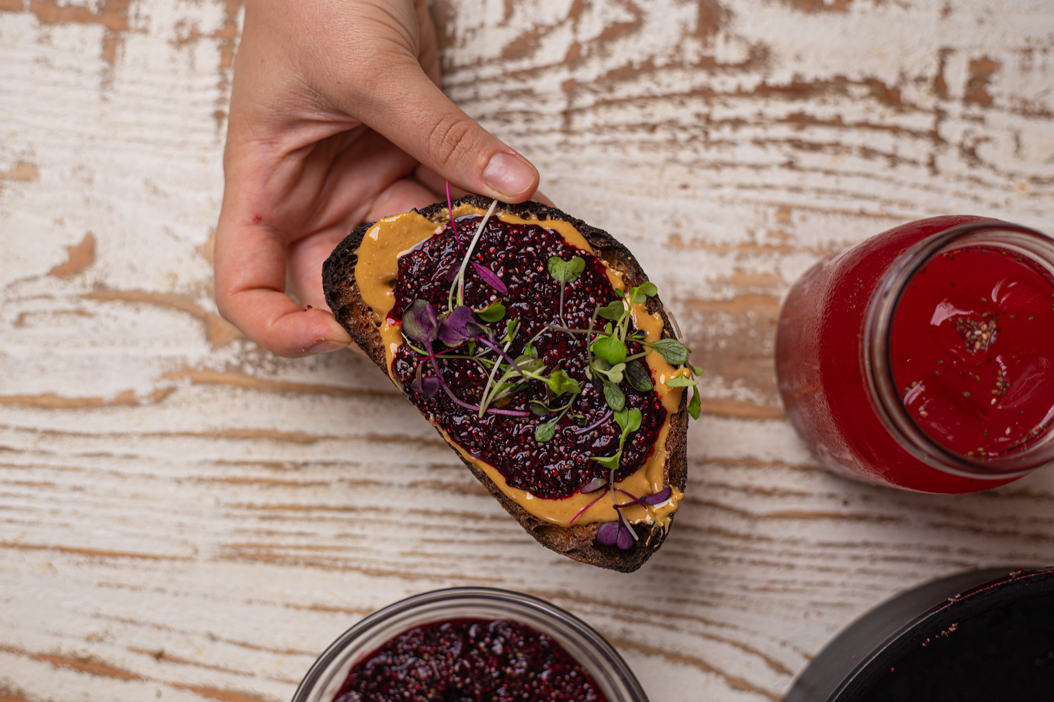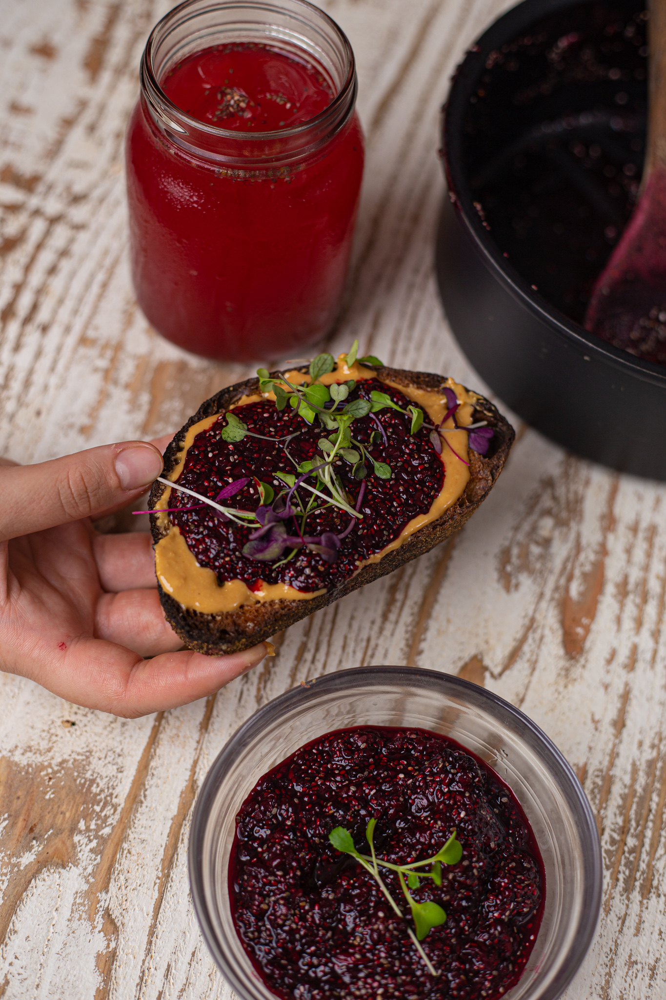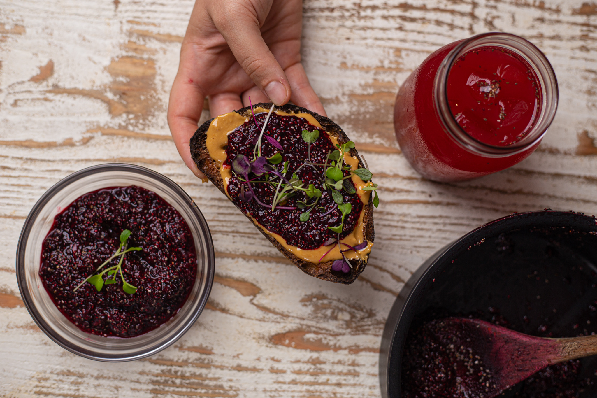 • Add chia seeds to the jam to thicken the preparation and add good-for-you fats.