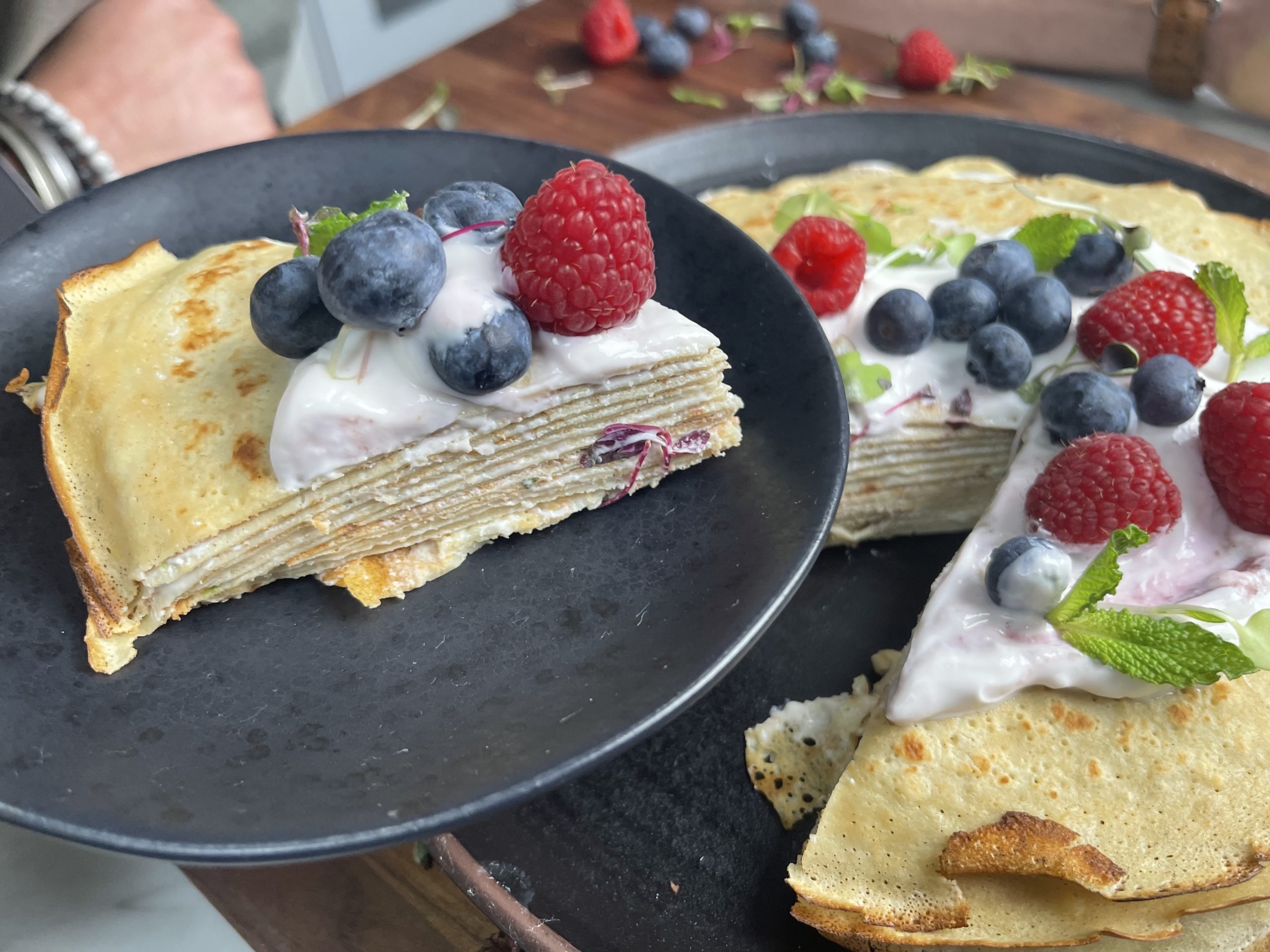2. On a plate, lay a crêpe and spread evenly 2 tbsp of the yogurt mixture on top. Lay another crêpe on top. Repeat the process. On top of the last crêpe, add berries and fresh mint.
