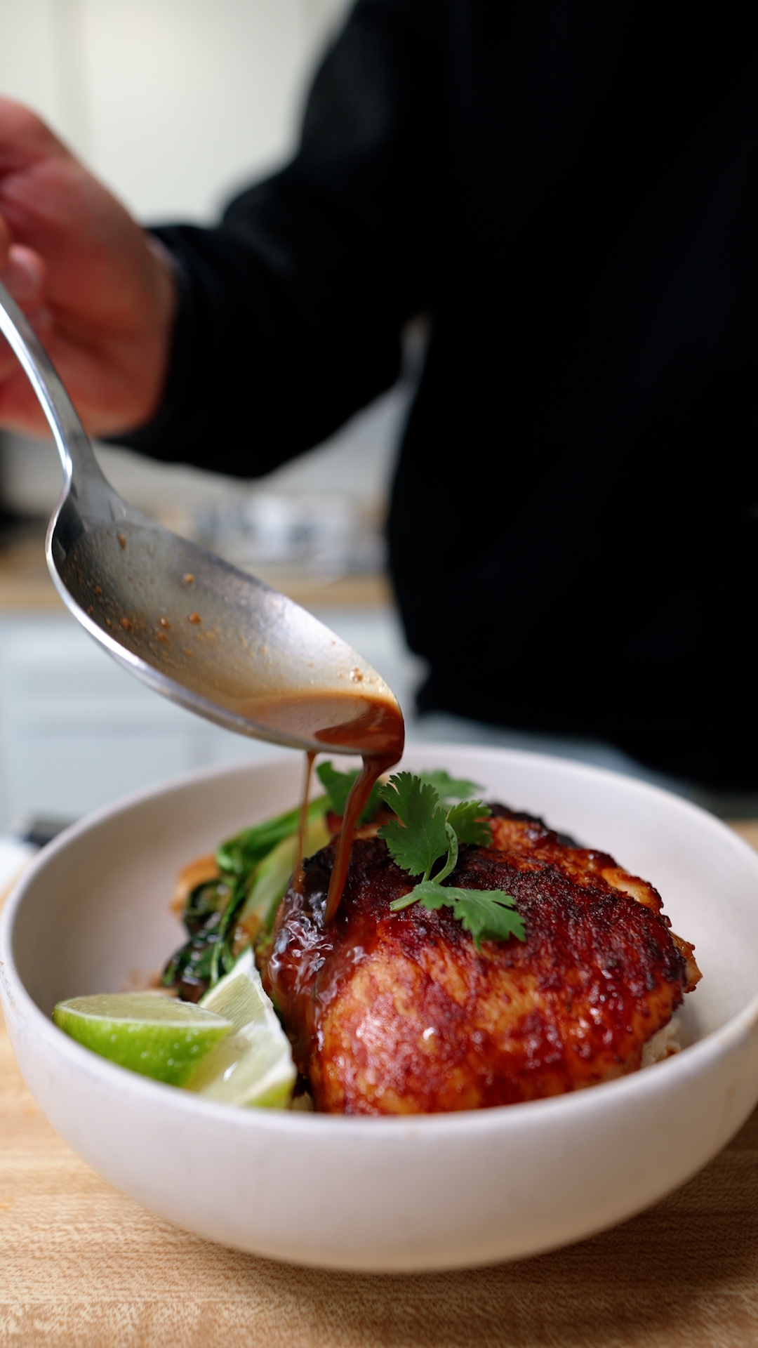 5. To serve, spoon in your cooked rice, place down some epic bok choy, chicken on top with a squeeze of lime and fresh coriander.