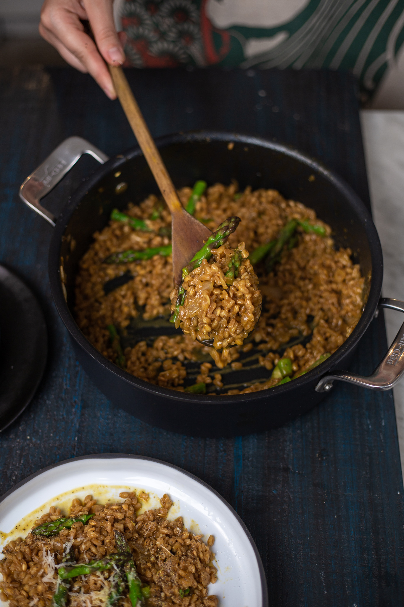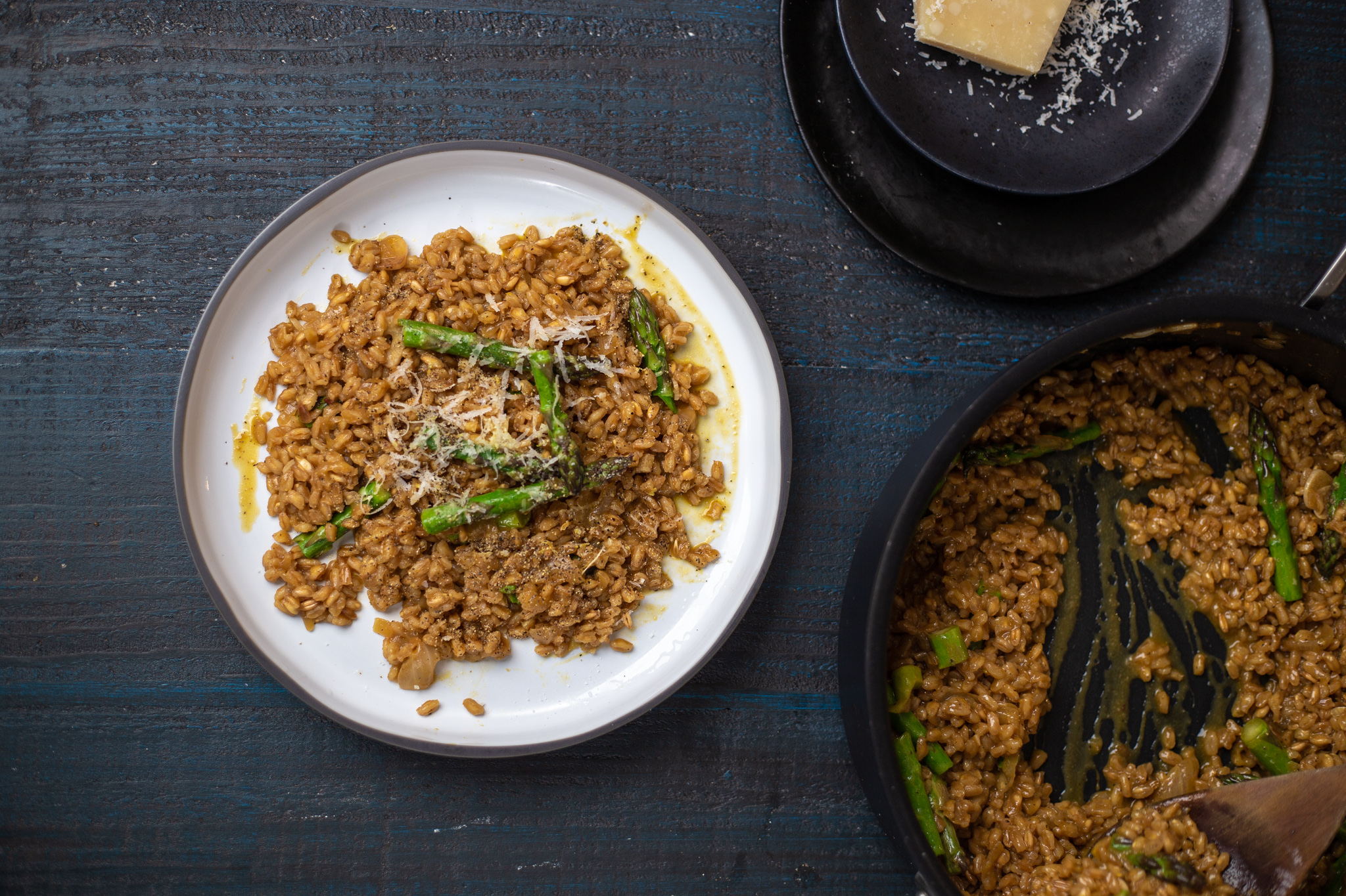 Risotto is a well-known dish made with rice. However, we are switching things up with farro. Here we make a creamy and tangy sauce using cheese and lemon and add asparagus for more fibers and plant goodness.