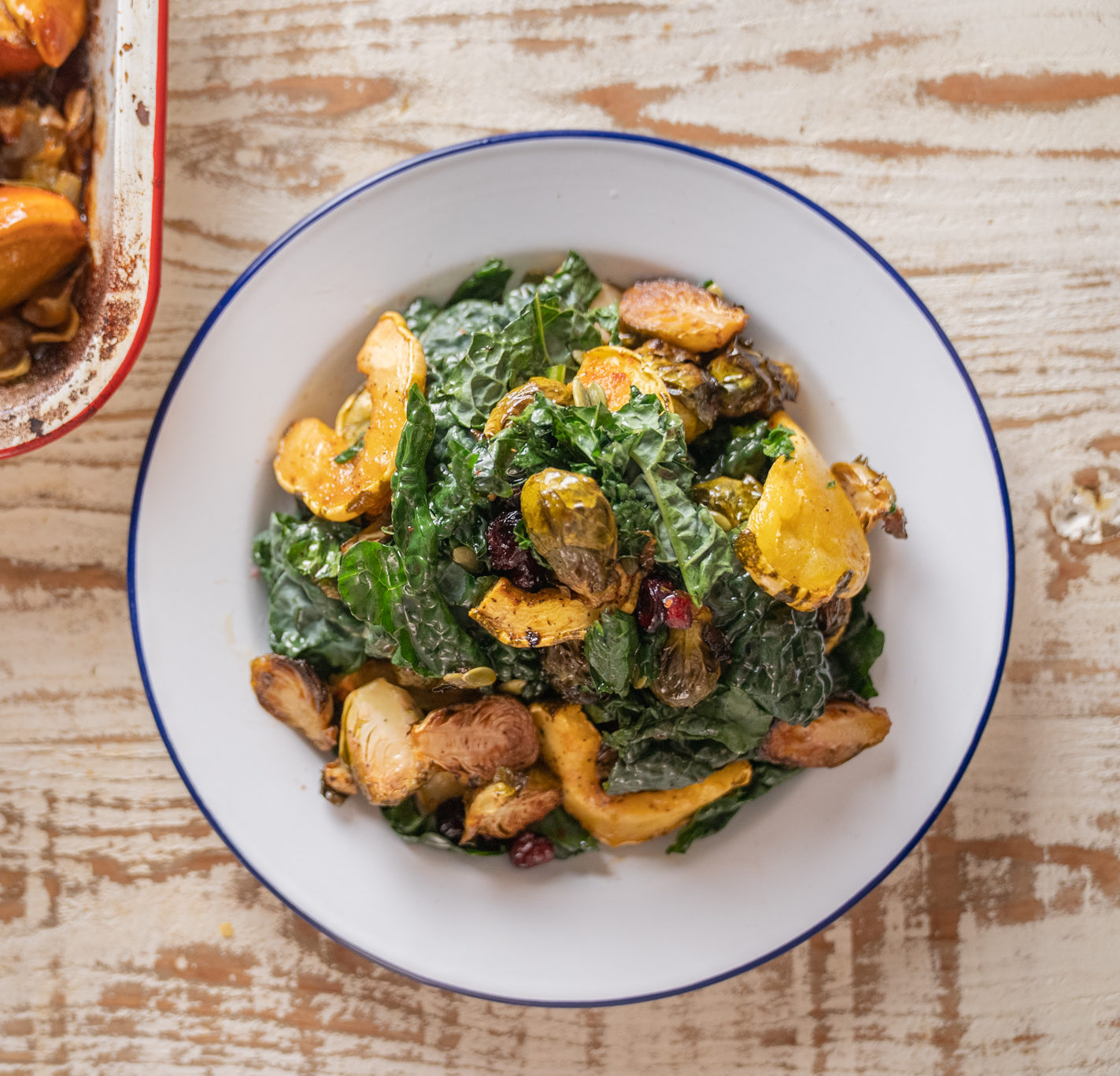 1. Add the kale, crispy Brussels sprouts, and squash on a large plate. Top with cranberries and pepitas. Drizzle the vinaigrette on top.